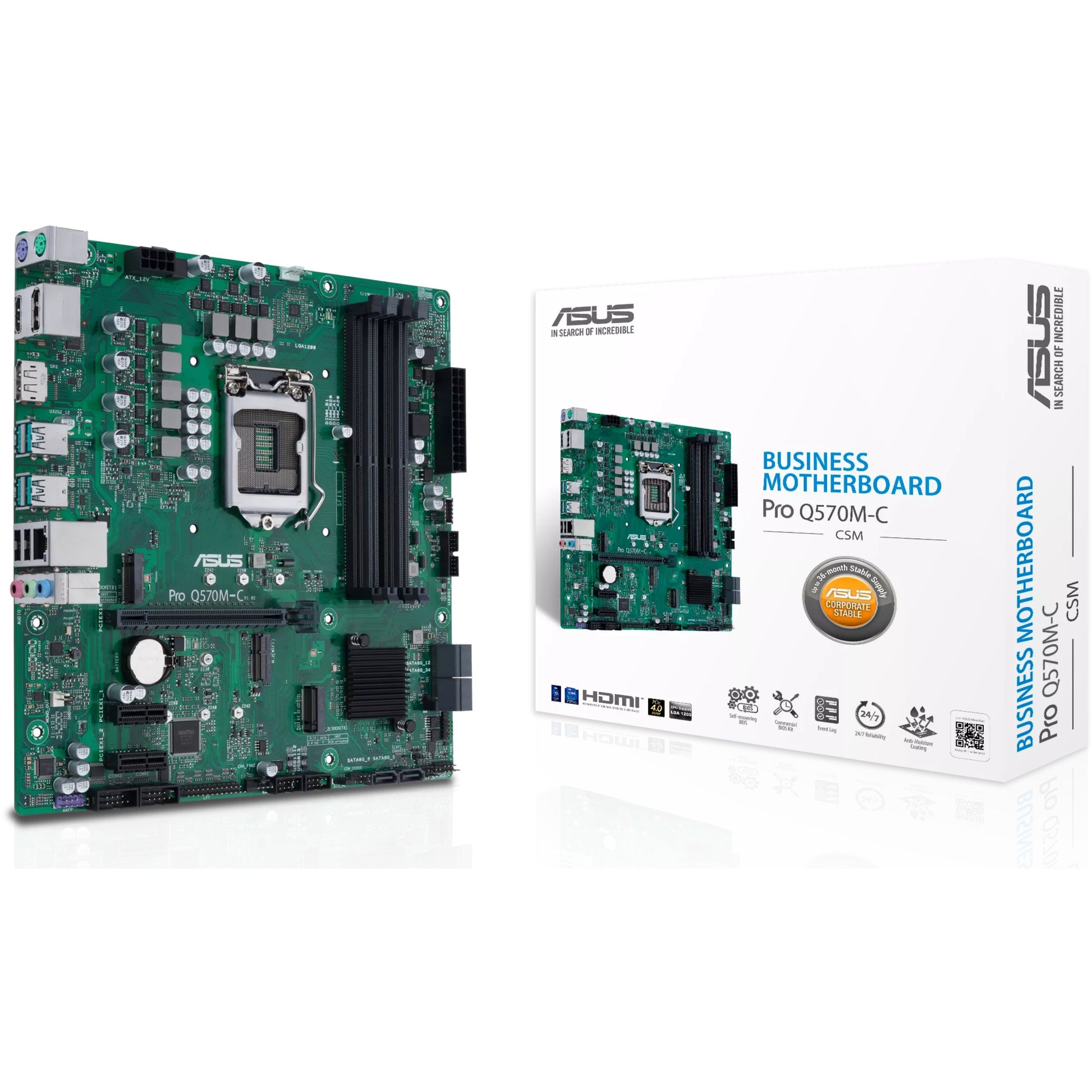 ASUS PRO Q570M-C/CSM. Prozessorhersteller: Intel, Prozessorsockel: LGA 1200 (Socket H5), Kompatible Prozessoren: Intel® Celeron®, Intel® Core™ i3, Intel® Core™ i5, Intel® Core™ i7, Intel® Core™ i9, Intel® Pentium®. Unterstützte Arbeitsspeicher: DDR4-SDRAM, RAM-Speicher maximal: 128 GB, Arbeitsspeicher Typ: DIMM. Unterstützte Speicherlaufwerk-Schnittstellen: M.2, SATA III. Maximale Auflösung: 4096 x 2304 Pixel. HDMI-Version: 1.4/2.0
