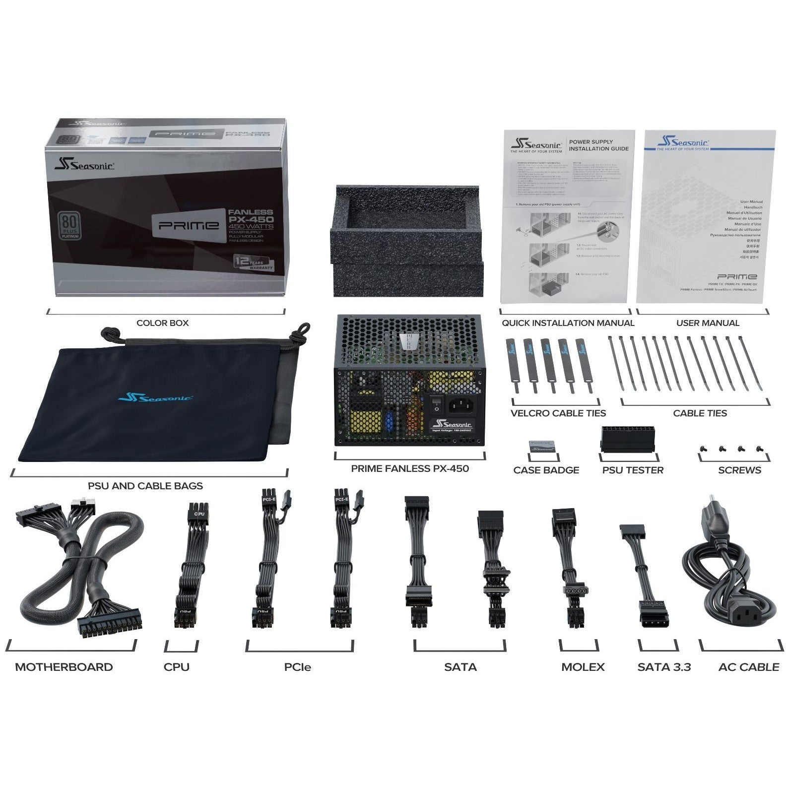 Seasonic PRIME Fanless PX. Gesamtleistung: 450 W, AC Eingangsspannung: 100 - 240 V, AC Eingangsfrequenz: 50 - 60 Hz. Motherboard Anschlussstecker: 20+4 pin ATX, Stromkabellänge Motherboard: 61 cm, SATA-Netzkabellänge: 810,860 mm. Zweck: PC, Stromversorgungseinheit (PSU) Formfaktor: ATX, 80 Plus Zertifizierung: 80 PLUS Platinum. Produktfarbe: Schwarz, Kühlung: Passiv, Lüfterdurchmesser: 13,5 cm. Konformitätsbescheinigungen: RoHS, Zertifizierung: cTUVus, TUV, CB, CCC, BSMI, EAC, CE, WEEE, ErP Lot 6, REACH