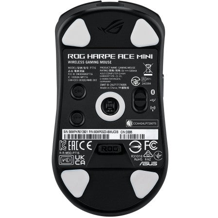 ASUS ROG Harpe Ace Mini. Formfaktor: Beidhändig. Bewegungerfassungs Technologie: Optisch, Geräteschnittstelle: RF Wireless + Bluetooth + USB Type-C, Bewegung Auflösung: 42000 DPI, Scroll Typ: Rad. Energiequelle: Batterien / Kabel. Produktfarbe: Schwarz