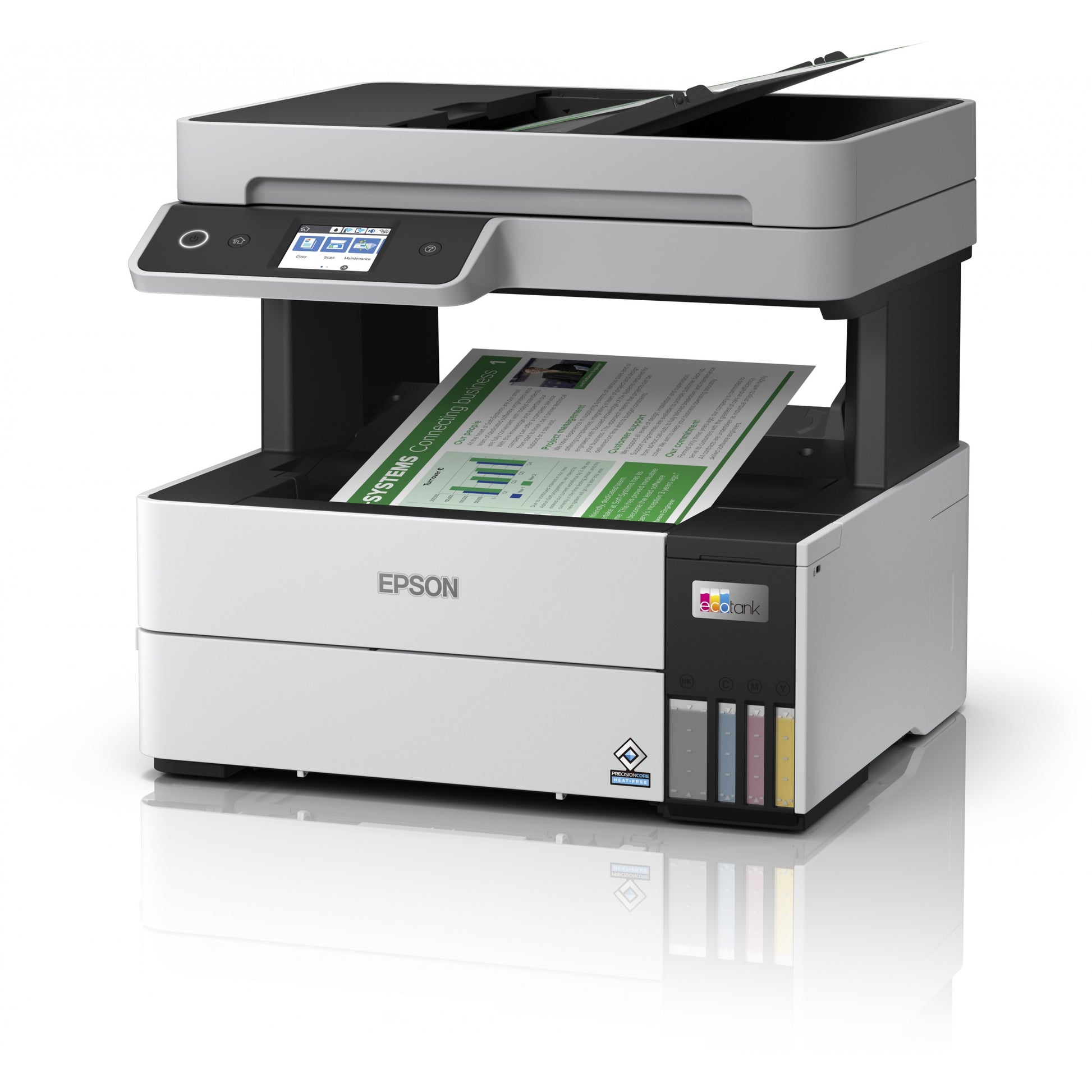 Epson EcoTank ET-5150. Drucktechnologie: Tintenstrahl, Drucken: Farbdruck, Maximale Auflösung: 4800 x 1200 DPI, Druckgeschwindigkeit (Farbe, normale Qualität, A4/US Letter): 23 Seiten pro Minute. Kopieren: Farbkopieren. Scannen: Farbscan, Optische Scan-Auflösung: 1200 x 2400 DPI. Maximale Papiergröße der ISO A-Serie: A4. WLAN. Direktdruck. Produktfarbe: Schwarz, Weiß